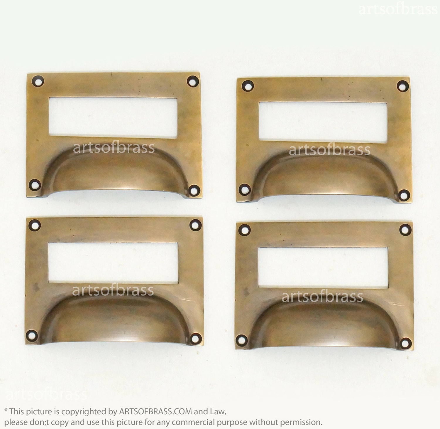 NOTE: For this Brass Label Holder Pull will be like on the pictures or may vary, maybe have a little dusk and uncleaned some maybe have fungus and not bright of brass, we just cover it with oil for protect that Brass Label Holder Pull as long you have plan ask or contact us for clean it before we ship it.